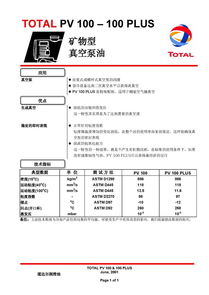 道達爾PV 100&100 PLUS真空泵油  詳細說明
