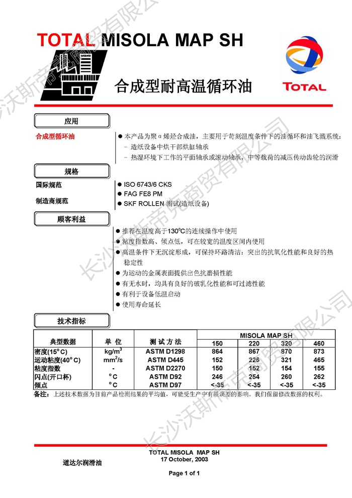 道達爾Misola MAP SH合成循環(huán)油 詳細說明
