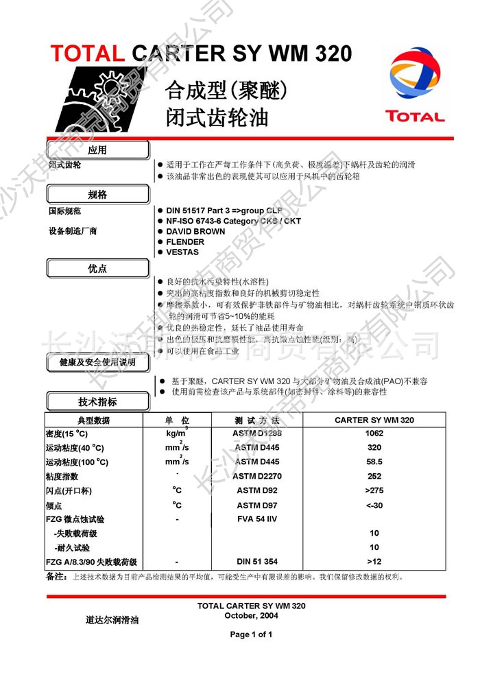 道達(dá)爾Carter SY WM含合成型(聚醚)閉式齒輪油 詳細(xì)說明
