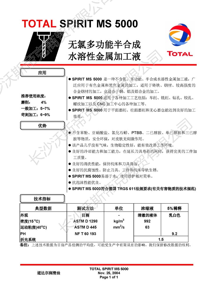 道達(dá)爾Spirit MS5000金屬加工液  詳細(xì)說明