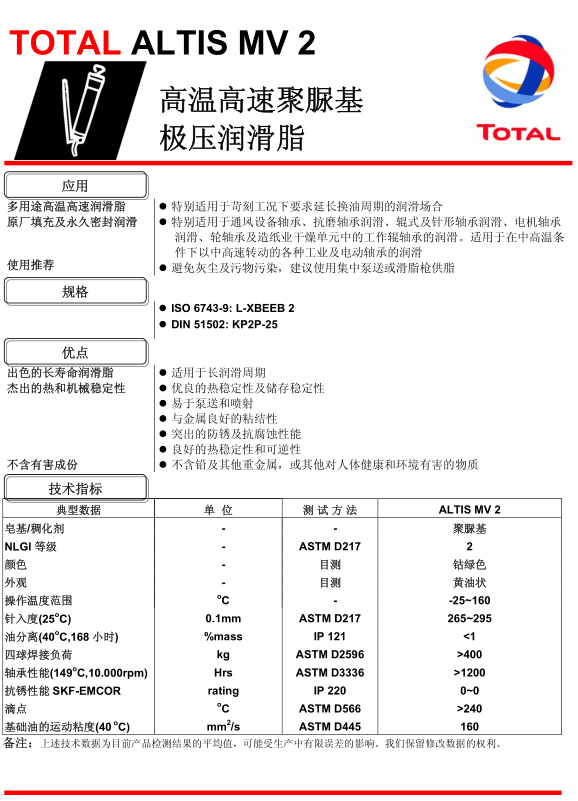 道達(dá)爾Altis MV2聚脲基潤滑脂 詳細(xì)說明