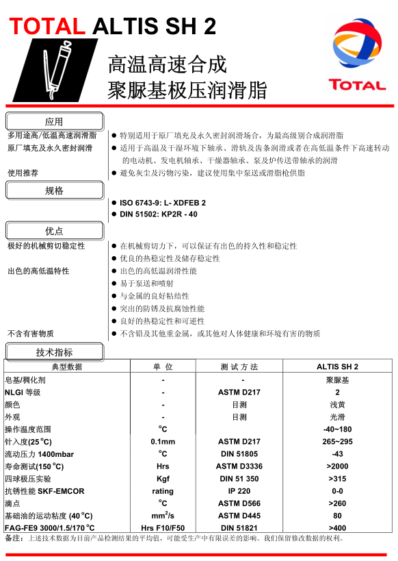 道達爾Altis SH2聚脲基潤滑脂 詳細說明